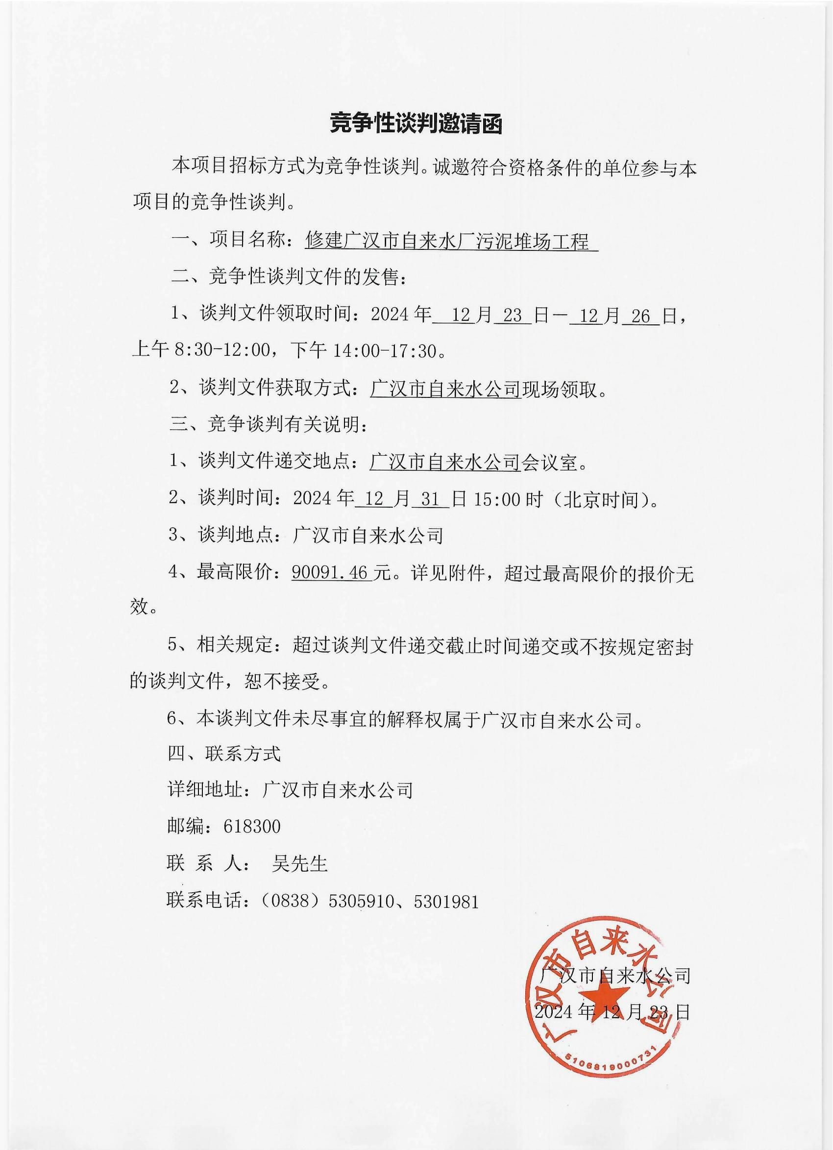 關(guān)于修建廣漢市自來(lái)水廠污泥堆場(chǎng)工程競(jìng)爭(zhēng)性談判邀請(qǐng)函