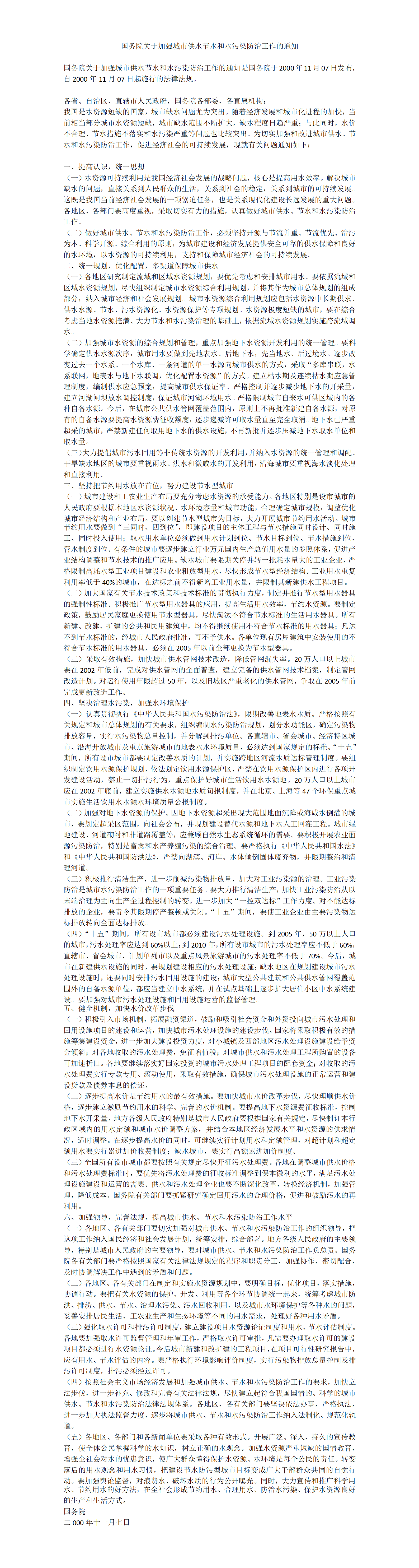 國(guó)務(wù)院關(guān)于加強(qiáng)城市供水節(jié)水和水污染防治工作的通知