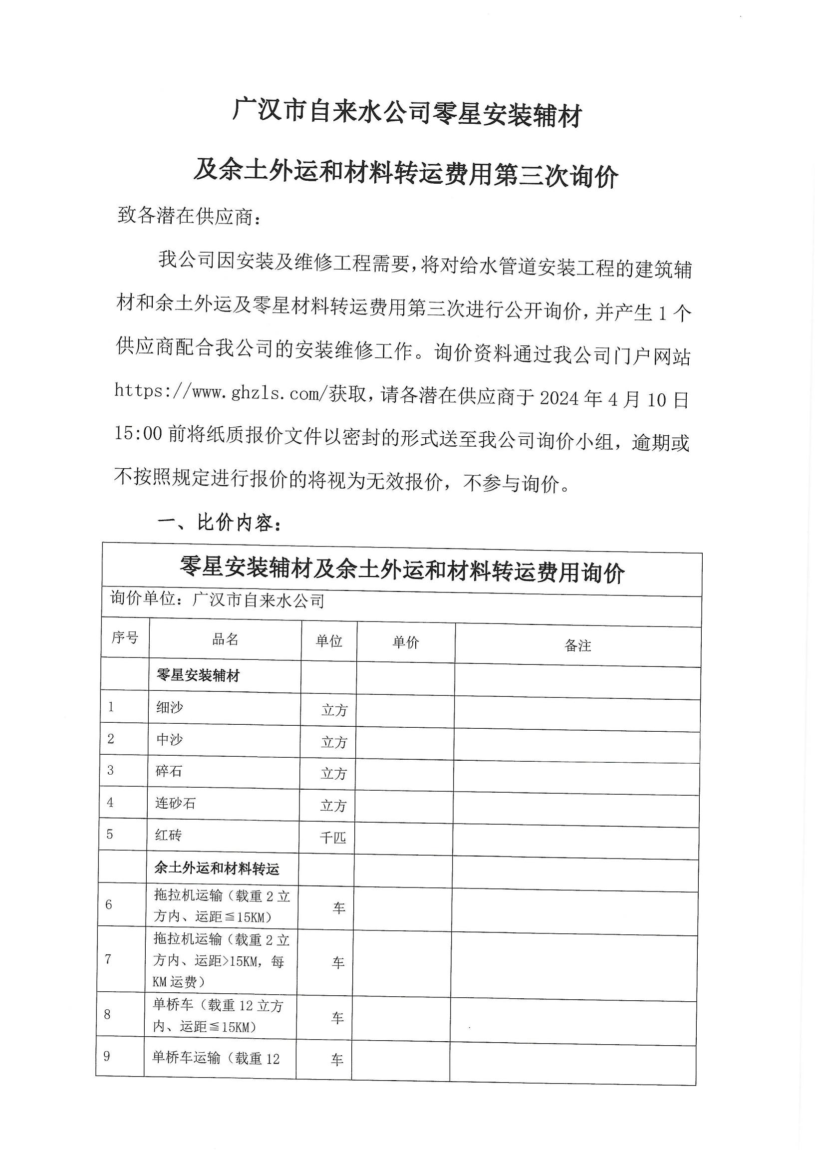 零星安裝輔材及余土外運和材料轉(zhuǎn)運費用第三次詢價
