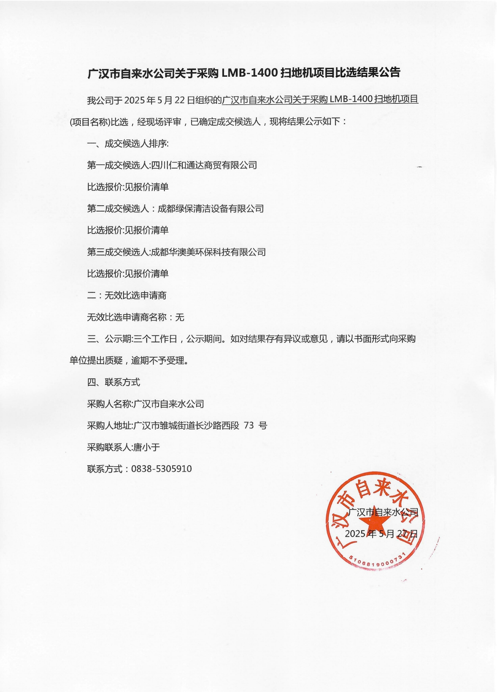 廣漢市自來(lái)水公司關(guān)于采購(gòu)LMB-1400掃地機(jī)項(xiàng)目比選結(jié)果公告