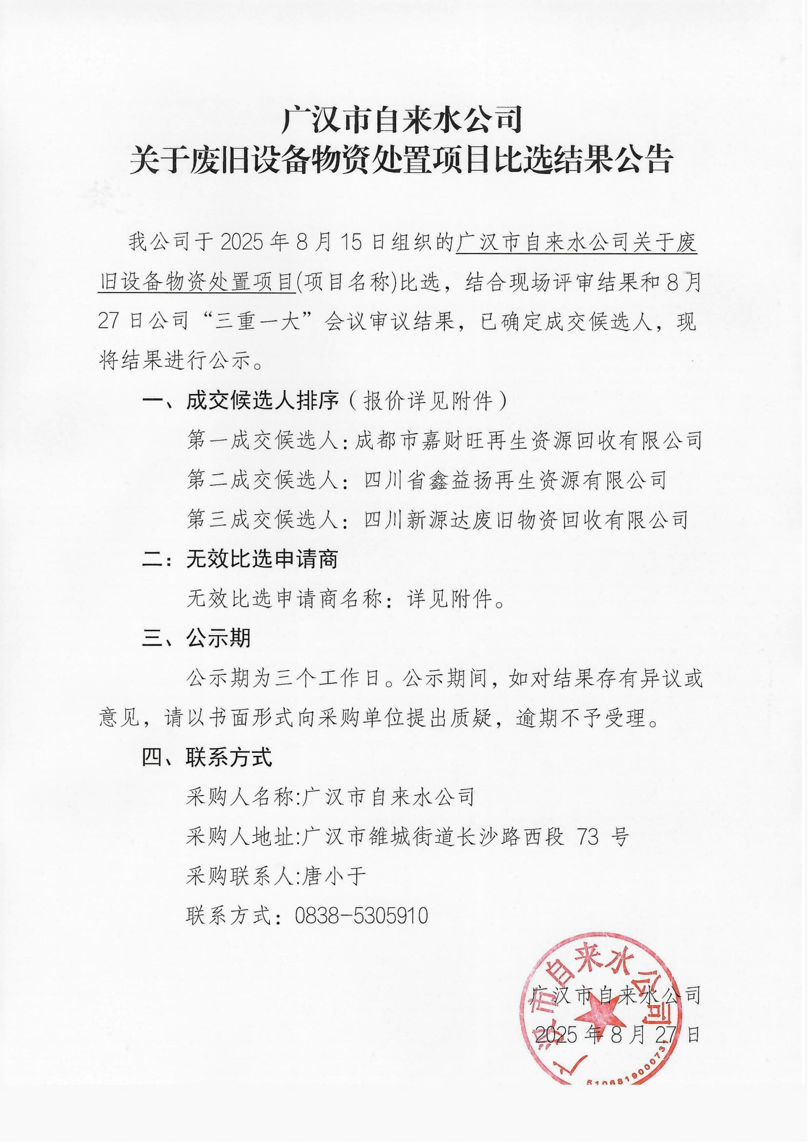 關(guān)于廢舊設(shè)備物資處置項(xiàng)目比選結(jié)果公告