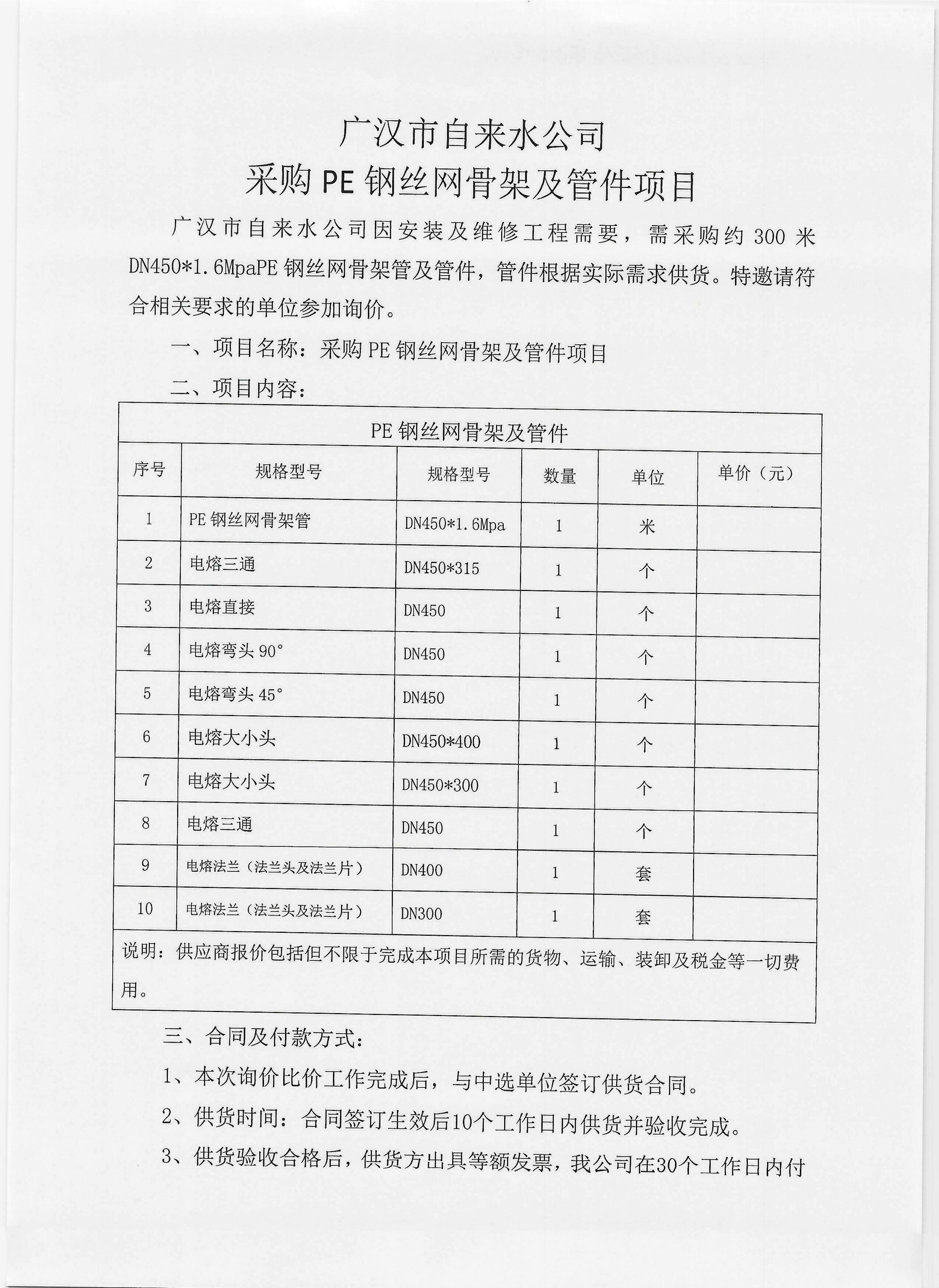 廣漢市自來水公司采購PE鋼絲網(wǎng)骨架及管件項(xiàng)目詢價(jià)單